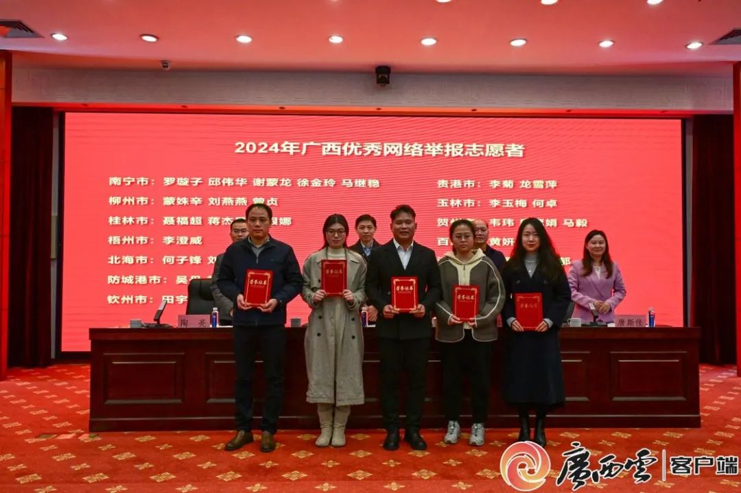 2025年1月8日,2024年广西优秀网络举报志愿者表彰活动在南宁举行,自治区党委网信办副主任谢建伟出席颁奖仪式并为获奖代表颁奖。 优秀网络举报志愿者代表上台领奖。广西云-广西日报记者 韦澍睿 摄 为提高举报积极性,广西互联网违法和不良信息举报中心通过积分制对举报工作进行评估,根据积分结果对网络举报志愿者进行表彰,2024年,来自全区14个设区市的41名同志获评优秀举报志愿者。 长期以来,广西始终坚持“网络举报为人民、网络举报靠人民”的工作理念,充分发挥社会监督力量在互联网违法和不良信息举报工作中的重要作用,面向全社会特别是大学生、网格员以及公职人员等重点人群进行宣传,积极组建网络举报志愿者队伍,对网络平台传播的各类违法和不良信息进行举报,推动网络空间共建共治共享。截至目前,已有2300多人加入全区网络举报志愿者队伍。 |